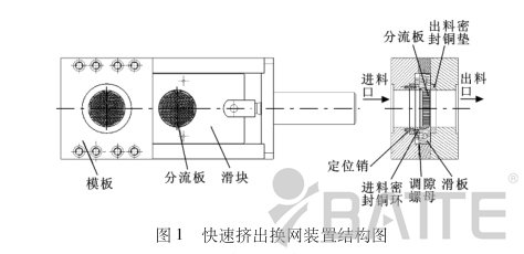板式換網(wǎng)器結(jié)構(gòu):它主要過濾部件由滑塊、定位銷、進(jìn)料密封銅環(huán)、調(diào)隙螺母、分流板和出料密封銅墊所組成,如圖1所示。調(diào)隙螺母主要作用是通過旋轉(zhuǎn)調(diào)節(jié),將進(jìn)料密封銅環(huán)和滑板一端作密封緊配合,防止塑料溶液從進(jìn)料密封銅環(huán)和滑板之間漏出;塑料溶液通過分流板進(jìn)行過濾,過濾后的塑料溶液通過出料口流出。